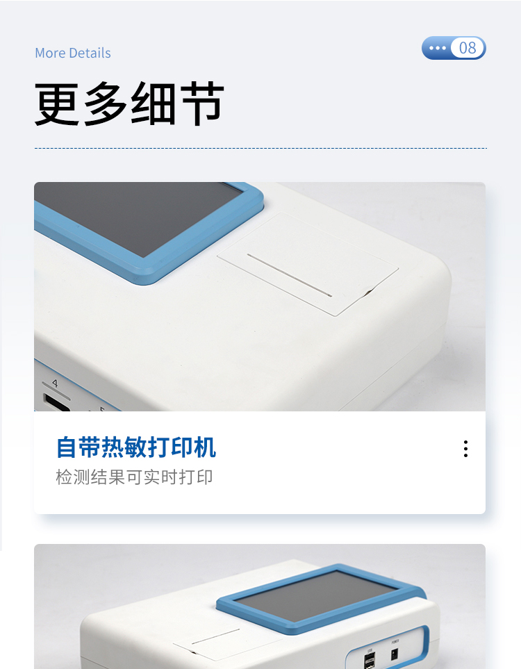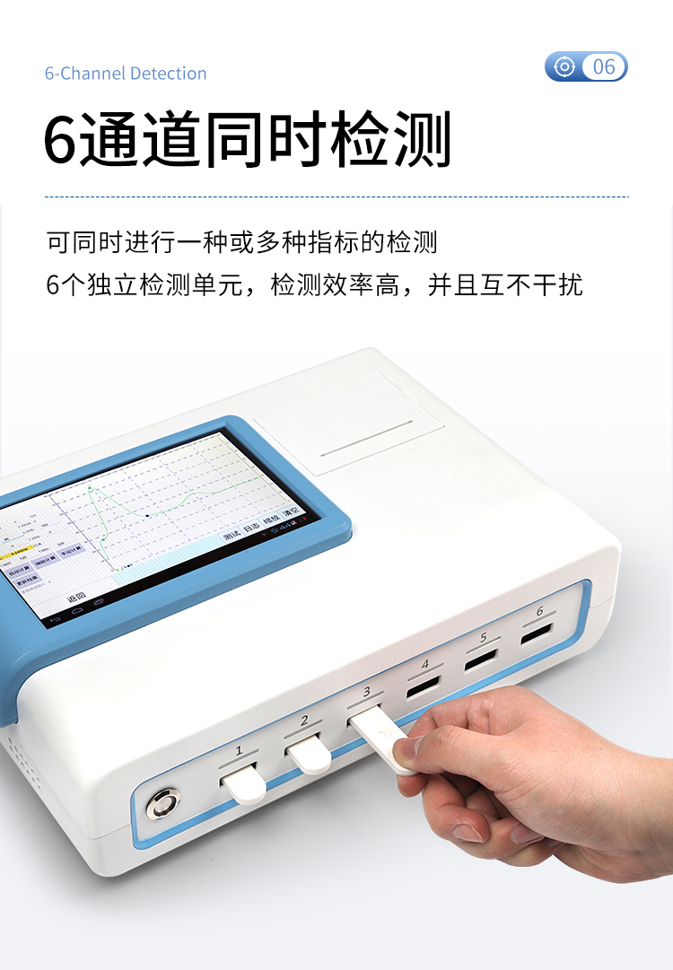 | 一體化設(shè)計(jì),集成孵育和檢測(cè)功能同時(shí)進(jìn)行,孵育完成直接檢測(cè); | 全中文 7英寸高清液晶顯示,觸摸屏操作; | Android 系統(tǒng),支持在線(xiàn)升級(jí),可WIFI聯(lián)網(wǎng); | 檢測(cè)原理:熒光定量免疫層析法; | 6通道設(shè)計(jì),可同時(shí)進(jìn)行一種或多種指標(biāo)的檢測(cè),6個(gè)獨(dú)立檢測(cè)單元,檢測(cè)效率高,并且互不干擾; | 具有二維碼自動(dòng)識(shí)別系統(tǒng),可直接識(shí)別檢測(cè)項(xiàng)目、檢測(cè)流程等信息; | 儀器自帶熱敏打印機(jī),檢測(cè)結(jié)果可實(shí)時(shí)打?。?/td> | 具有檢測(cè)數(shù)據(jù)存儲(chǔ)(存儲(chǔ)數(shù)量不少于 10000 條)、查詢(xún)、批量數(shù)據(jù)處理和打印功能; | 儀器≥2 個(gè)USB 接口,可拷貝結(jié)果及原始數(shù)據(jù),具有 wifi 接入模塊,可通過(guò)無(wú)線(xiàn)連接網(wǎng) 絡(luò)實(shí)現(xiàn)數(shù)據(jù)上傳; | 分鐘內(nèi)達(dá)到工作狀態(tài)(37℃),封閉系統(tǒng),不受外界環(huán)境(光、熱)干擾,工作環(huán)境溫度:0-30℃; | 相對(duì)極差≤10%; | 重復(fù)性 CV≤1%; | 批間變異≤3%; | 尺寸310x210x93mm |