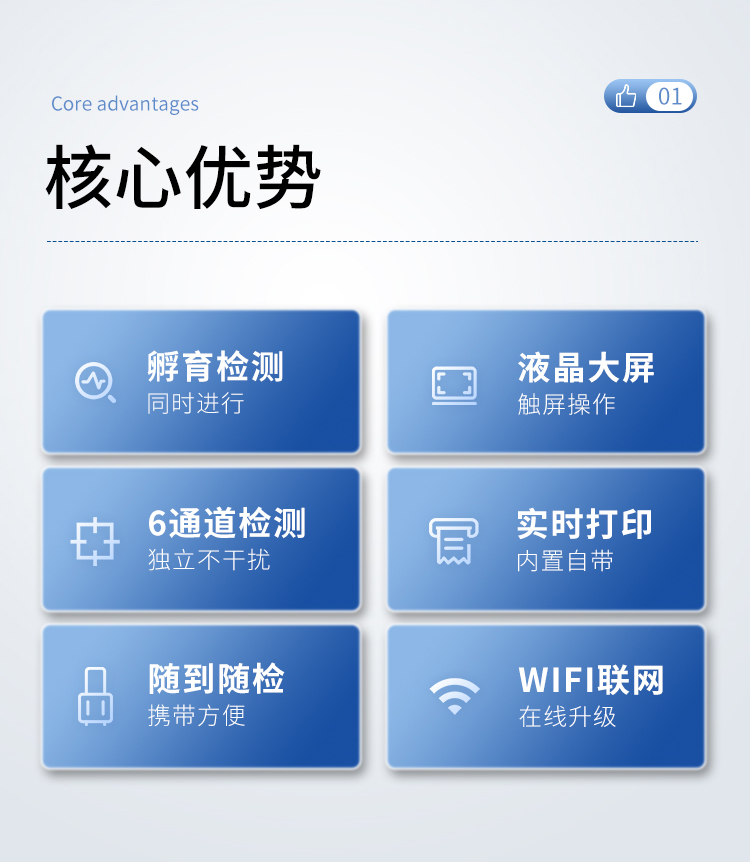 | 一體化設(shè)計(jì),集成孵育和檢測(cè)功能同時(shí)進(jìn)行,孵育完成直接檢測(cè); | 全中文 7英寸高清液晶顯示,觸摸屏操作; | Android 系統(tǒng),支持在線升級(jí),可WIFI聯(lián)網(wǎng); | 檢測(cè)原理:熒光定量免疫層析法; | 6通道設(shè)計(jì),可同時(shí)進(jìn)行一種或多種指標(biāo)的檢測(cè),6個(gè)獨(dú)立檢測(cè)單元,檢測(cè)效率高,并且互不干擾; | 具有二維碼自動(dòng)識(shí)別系統(tǒng),可直接識(shí)別檢測(cè)項(xiàng)目、檢測(cè)流程等信息; | 儀器自帶熱敏打印機(jī),檢測(cè)結(jié)果可實(shí)時(shí)打??; | 具有檢測(cè)數(shù)據(jù)存儲(chǔ)(存儲(chǔ)數(shù)量不少于 10000 條)、查詢、批量數(shù)據(jù)處理和打印功能; | 儀器≥2 個(gè)USB 接口,可拷貝結(jié)果及原始數(shù)據(jù),具有 wifi 接入模塊,可通過(guò)無(wú)線連接網(wǎng) 絡(luò)實(shí)現(xiàn)數(shù)據(jù)上傳; | 分鐘內(nèi)達(dá)到工作狀態(tài)(37℃),封閉系統(tǒng),不受外界環(huán)境(光、熱)干擾,工作環(huán)境溫度:0-30℃; | 相對(duì)極差≤10%; | 重復(fù)性 CV≤1%; | 批間變異≤3%; | 尺寸310x210x93mm |